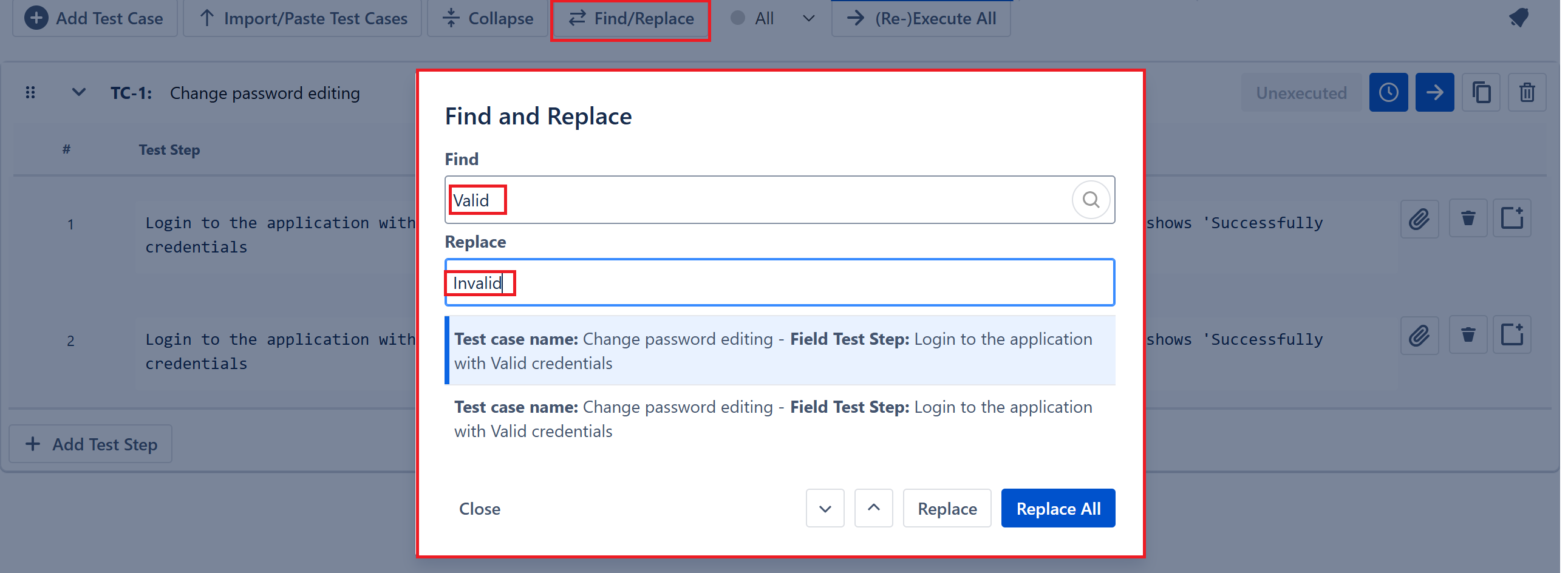 Click Find/Replace button from Functions menu to open the pop-up. Enter value to Find. Enter value to Replace Select the result to Replace value for only chosen field, or Replace All values for all fields.